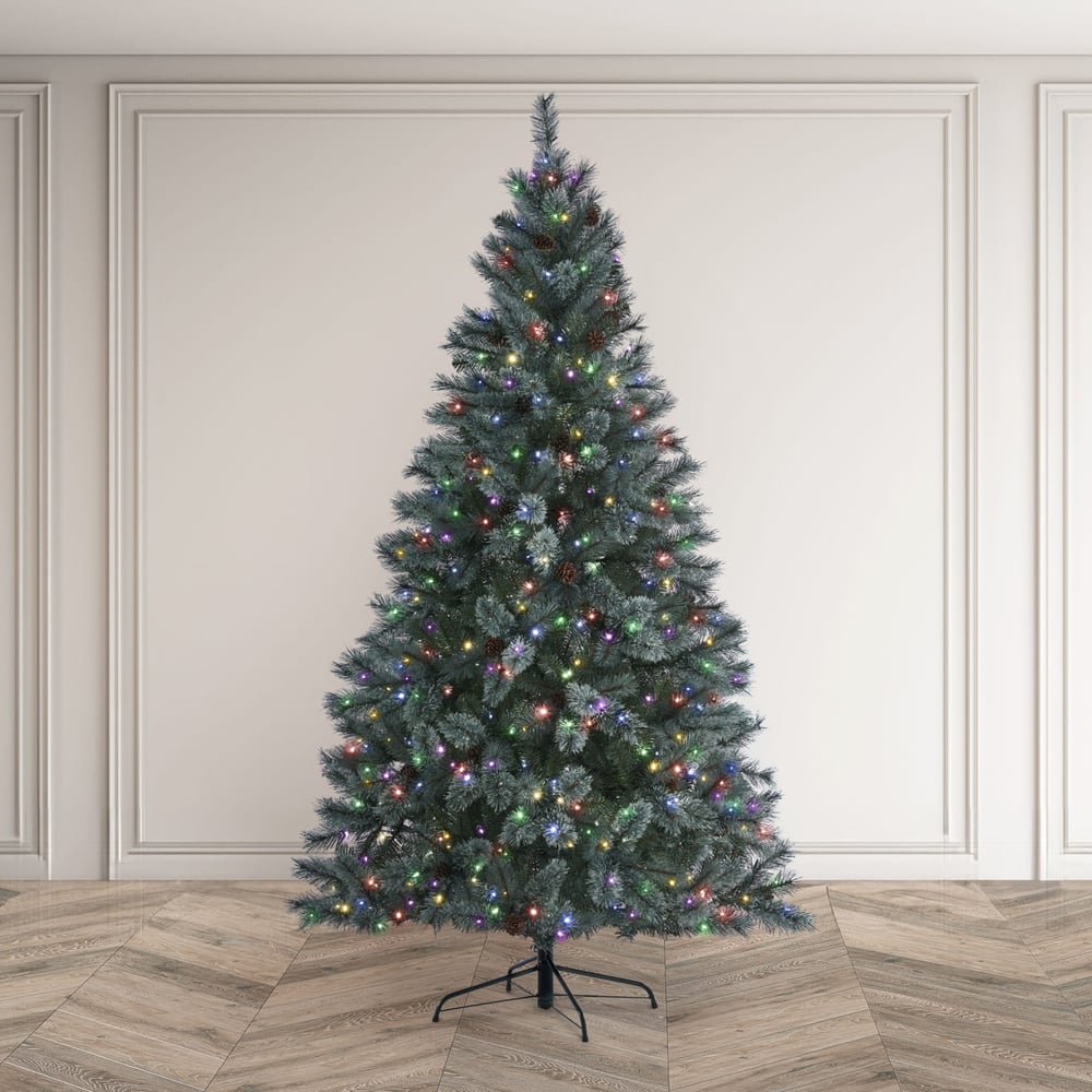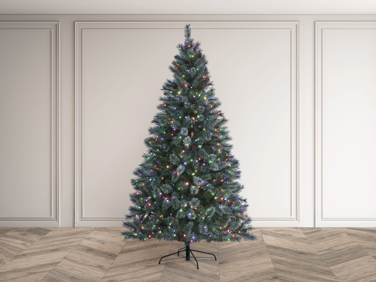 Pre-lit with 600 Colour Switch LEDs (warm white and multicolour) and complete with cones and a 16-function remote control, it brings a sparkle and festive charm to any home.